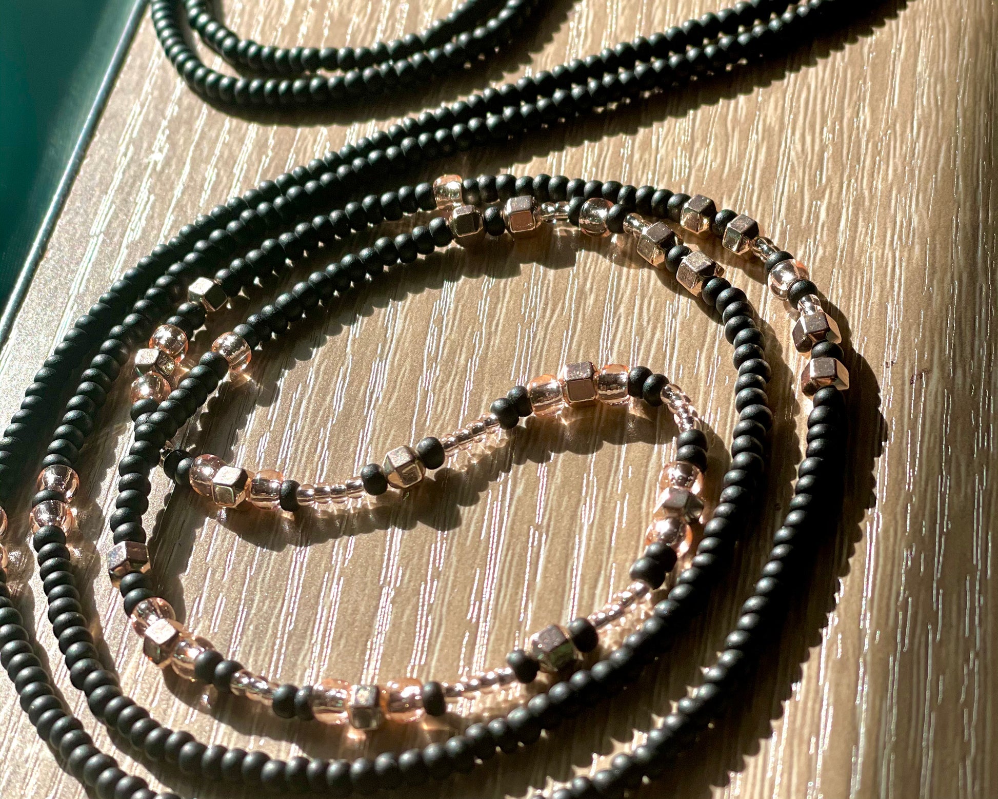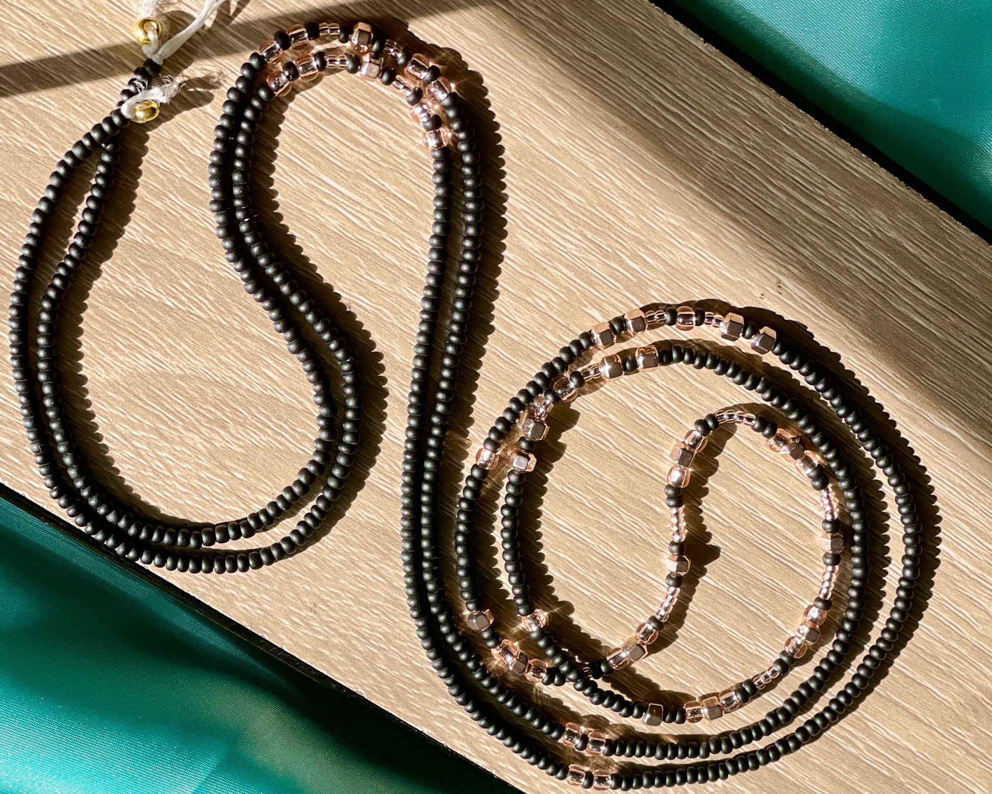Adorn yourself in these waist beads engulfed in rose gold plated hematite beads. Classy and sexy.